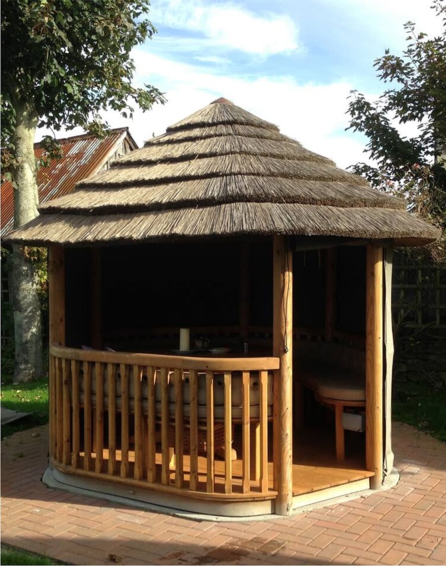 Outside, a sheltered seating and dining hut provides a comfortable space to relax in all weathers — an inviting spot to unwind after a beach walk or a day exploring Dornoch and the surrounding Highlands. Private parking is available and the cottage is dog friendly.