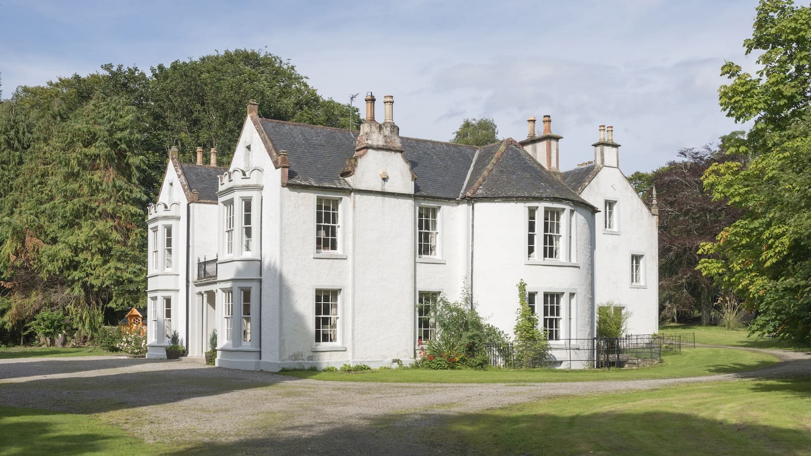 The house is set in 33 acres, including a secret walled garden, terraced lawns to the front, mature trees and rhododendrons, and an ancient burial ground of the Romanes family. The approach to the house includes views of the Cromarty Firth and the Black Isle, and in spring is a riot of wildflowers including bluebells and daffodils.
